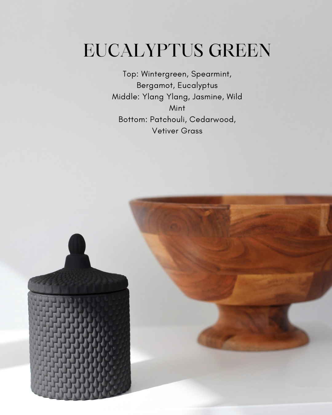 Eucalyptus Green Vintage Matte Candle, a refreshing oasis captured within a chic vessel. This invigorating scent journey begins with a crisp blend of wintergreen, spearmint, zesty bergamot, and the unmistakable essence of eucalyptus, awakening the senses with each delicate flame.