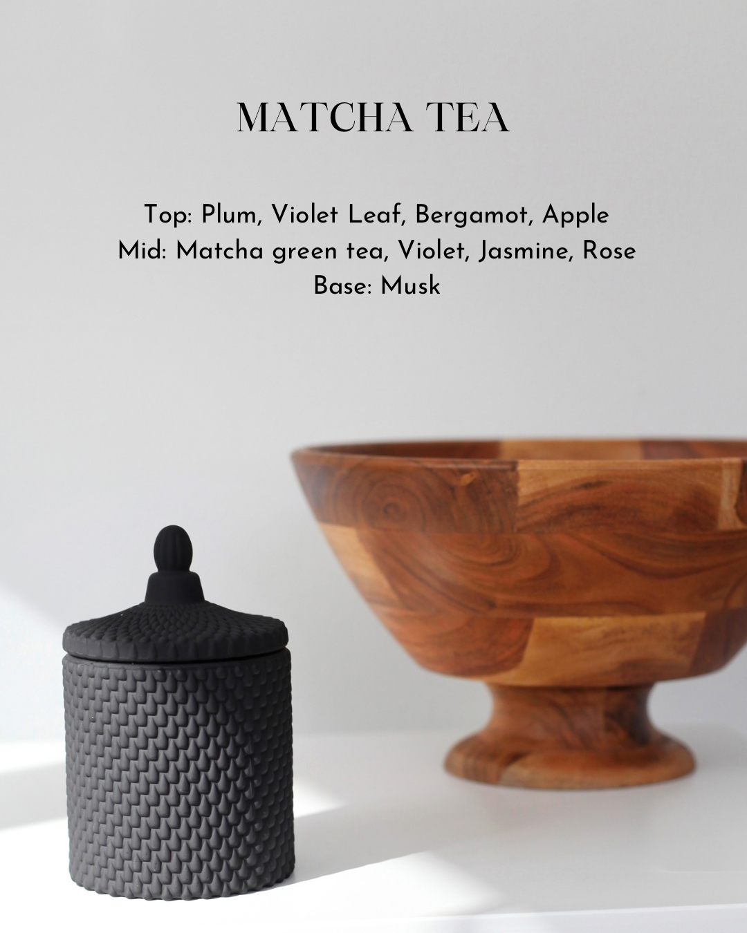 Ground yourself with the earthy essence of matcha tea. This candle carries the calming aroma of fresh green tea leaves blended with subtle earthy undertones, evoking the serenity of a Japanese teahouse. Housed in a sleek vintage matte black vessel, it brings sophistication and tranquility to any space.