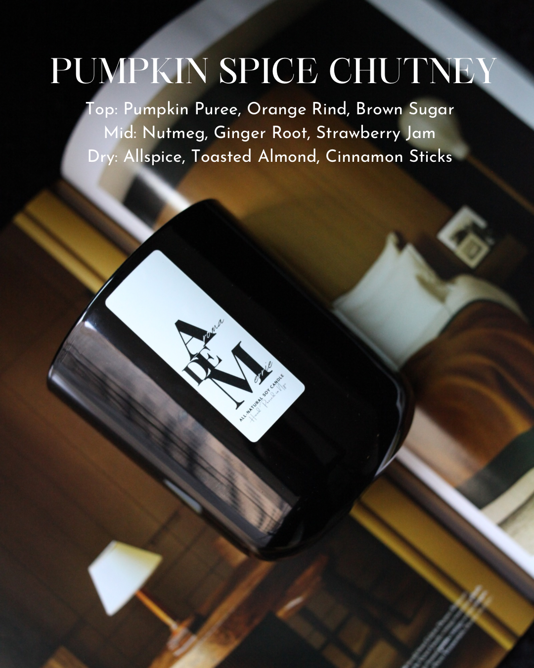 Immerse yourself in the spirit of autumn with our Pumpkin Spice Chutney luxe black candle, crafted to capture the cozy essence of the season. This candle combines the warmth of pumpkin purée and brown sugar with the vibrant zest of orange rind, creating a welcoming and aromatic atmosphere. As it burns, notes of nutmeg, ginger root, and a hint of strawberry jam infuse the air, bringing to mind the delights of freshly baked autumn treats. The lingering base of allspice, toasted almond, and cinnamon sticks adds a soothing finish, perfect for cool fall nights.
