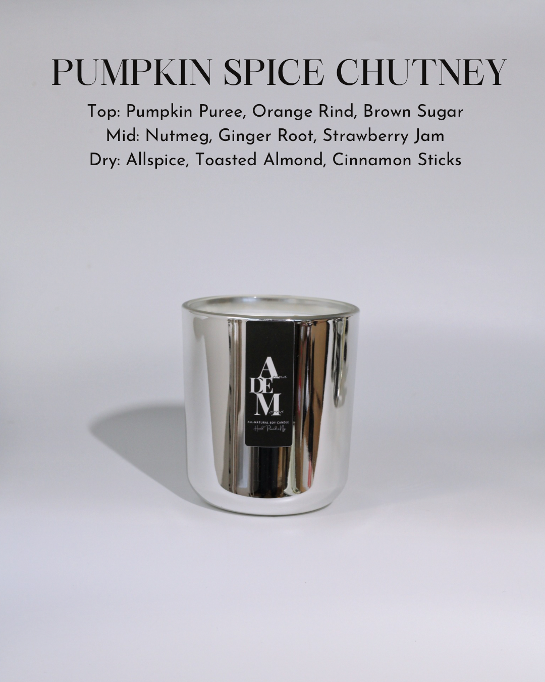 Fill your home with the cozy glow of autumn through our Pumpkin Spice Chutney Candle presented in a modern chrome vessel that reflects the flicker of the flame. This seasonal fragrance opens with creamy pumpkin purée, sweet brown sugar and a touch of orange rind. A heart of nutmeg, ginger root and allspice adds warmth while toasted almond, cinnamon sticks and strawberry jam create a rich and comforting finish.
